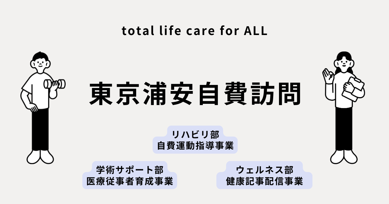 東京浦安自費訪問では、自費訪問運動指導の提供を行っております。医療保険・介護保険内でのリハビリでは物足りない方、医療保険・介護保険サービス対象外の方、ご自身の複合的な疾患に合わせた総合的な健康管理を行っていきたい方など、皆さん個人の希望に合わせたサービスを行っています。対象者に関しては、すべての方を対象としており、対象外となる方は誰一人ございません。